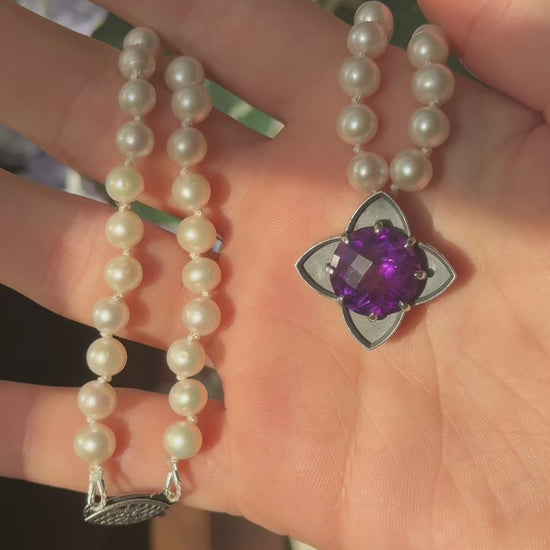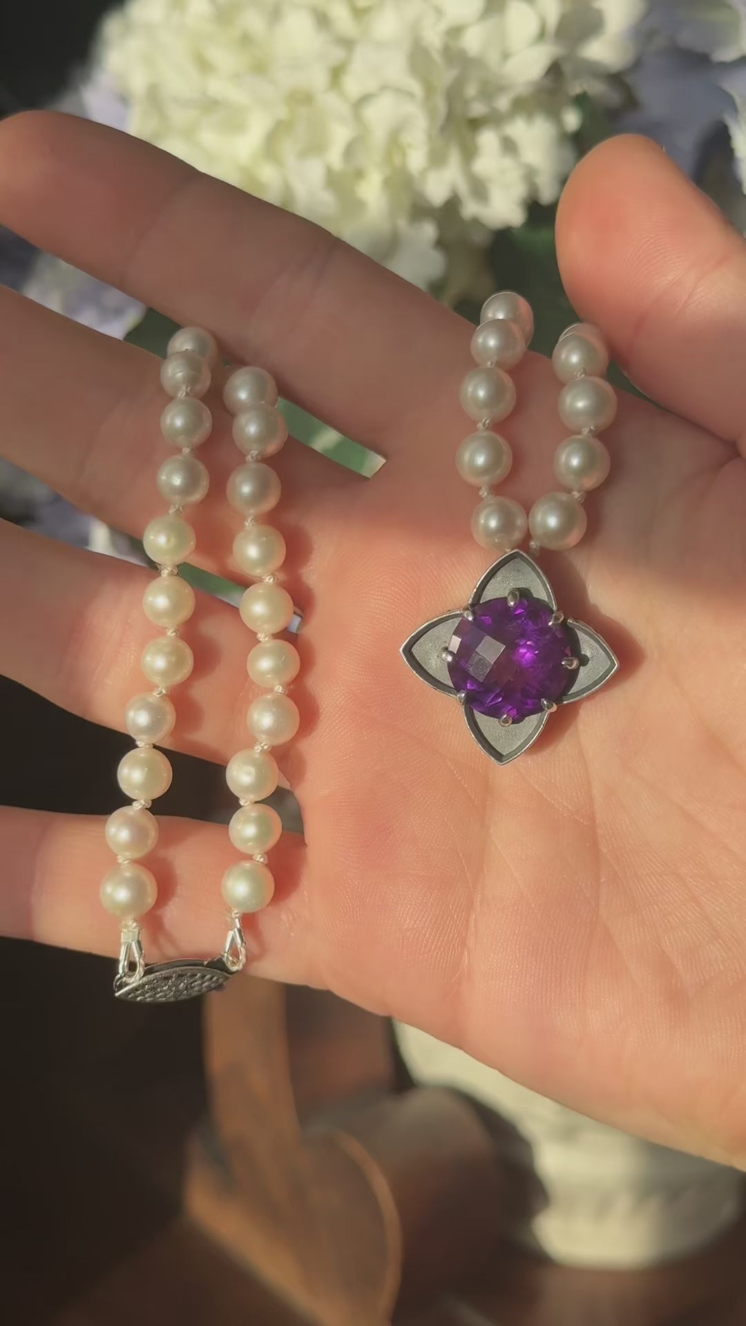 Part of the October drop, this necklace features a deep purple Amethyst checkerboard cut stone, set in Sterling Silver, strung on 100% silk thread, with white fresh water pearls, finished with a Sterling Silver filigree clasp. The necklace is 22" in length.