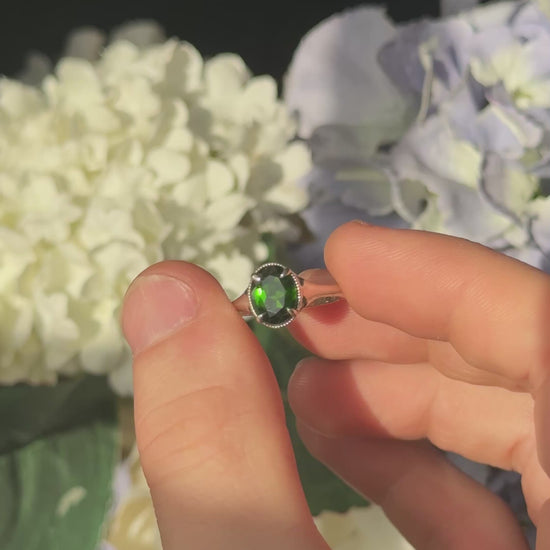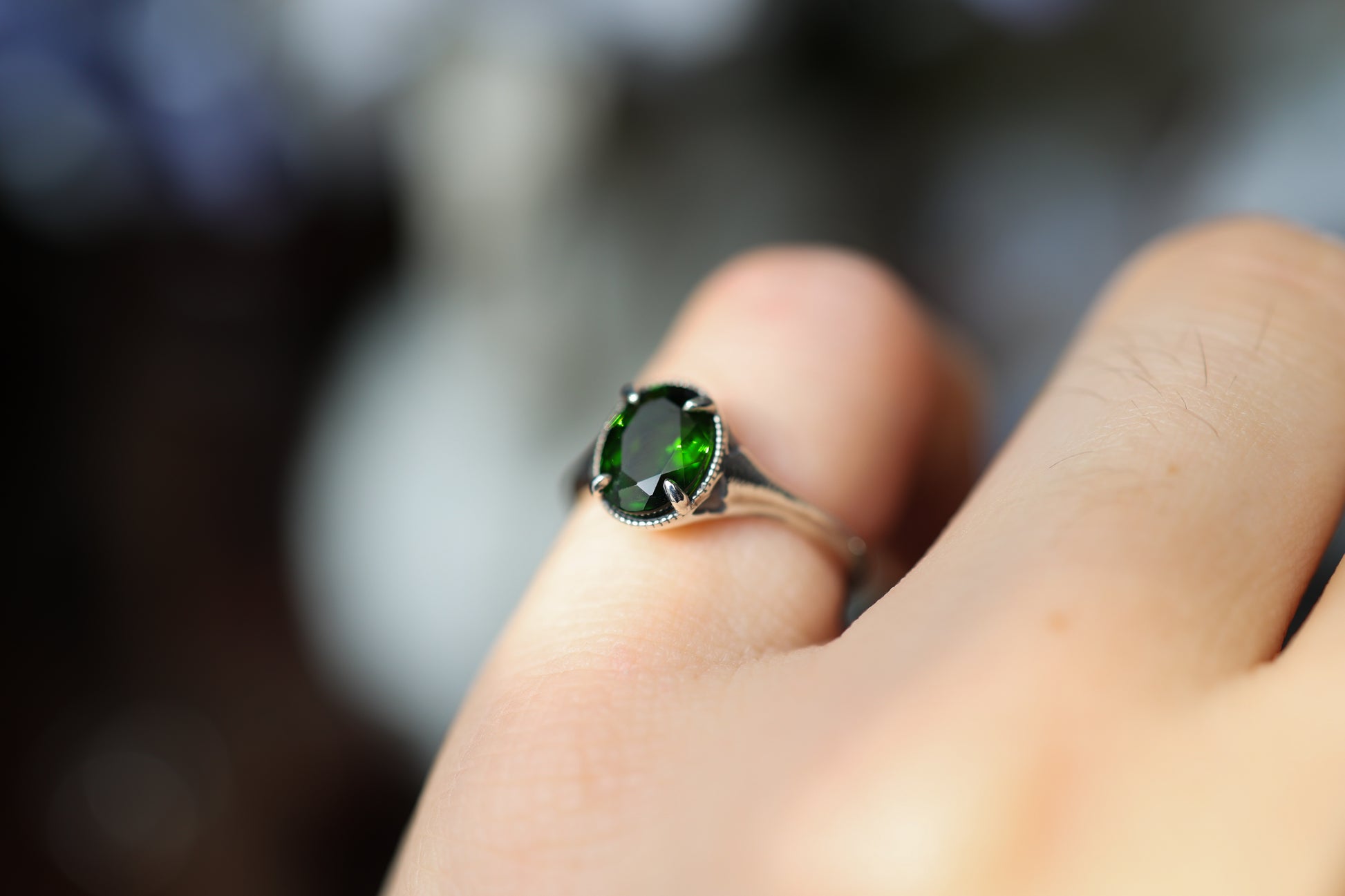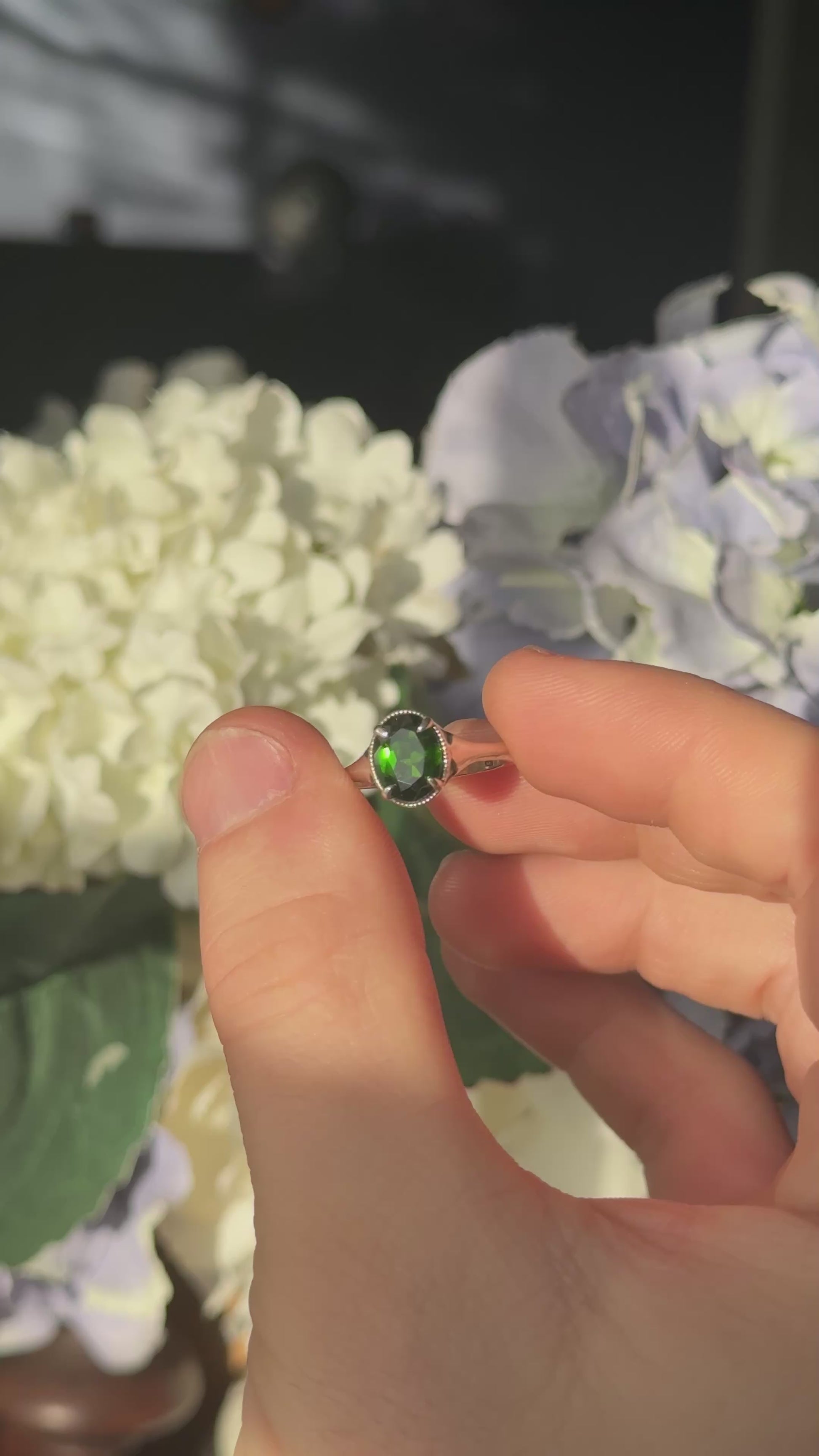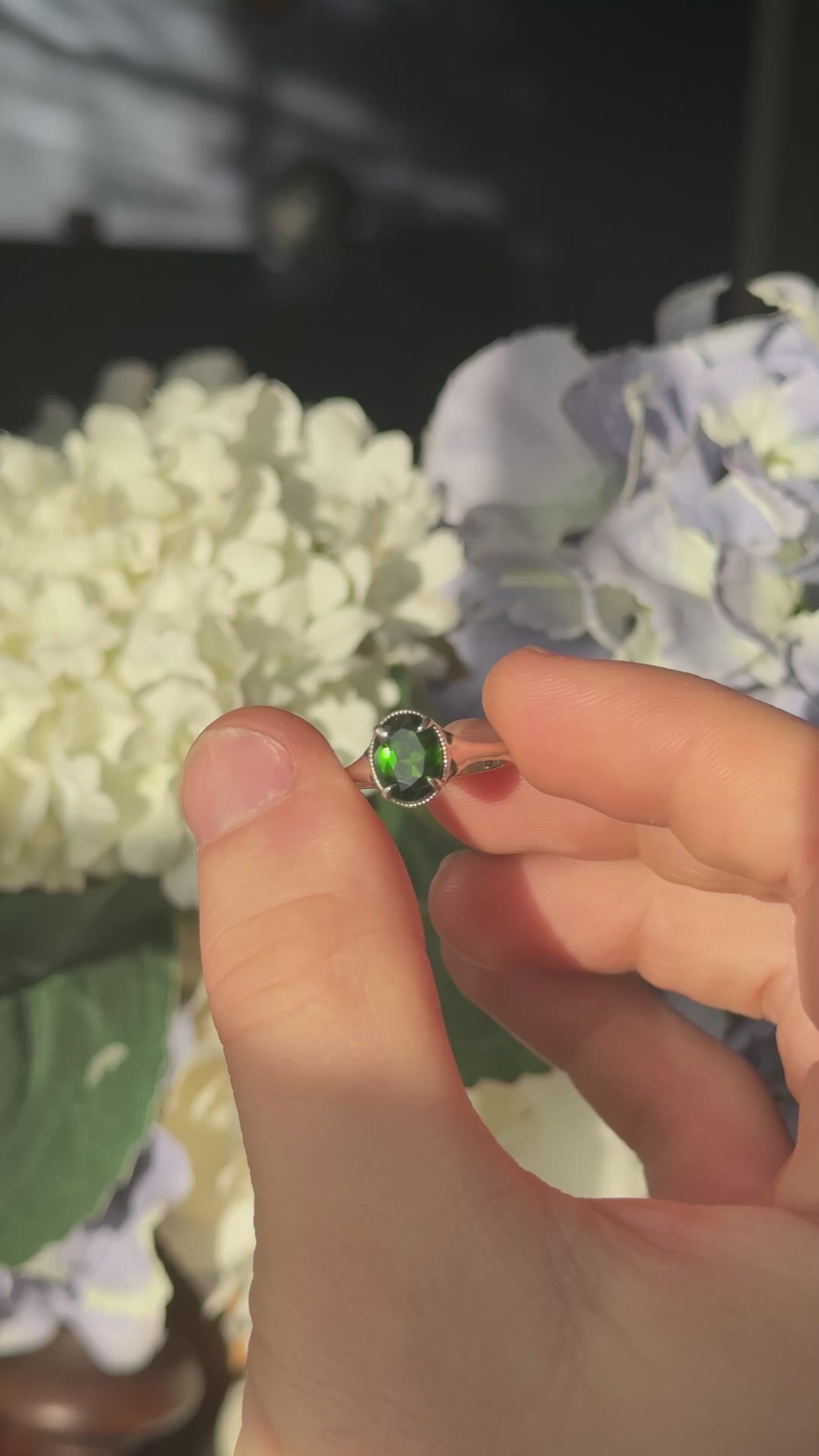 Part of the October Drop, this ring was inspired by Gothic Architecture, with its tracery embossments and milgrain setting. The stone, a deep green Chrome Diopside was chosen for its vibrant, powerful colouring. Named after an all time favourite Disney villain Maleficent, as the green is akin to the colour of her magic.